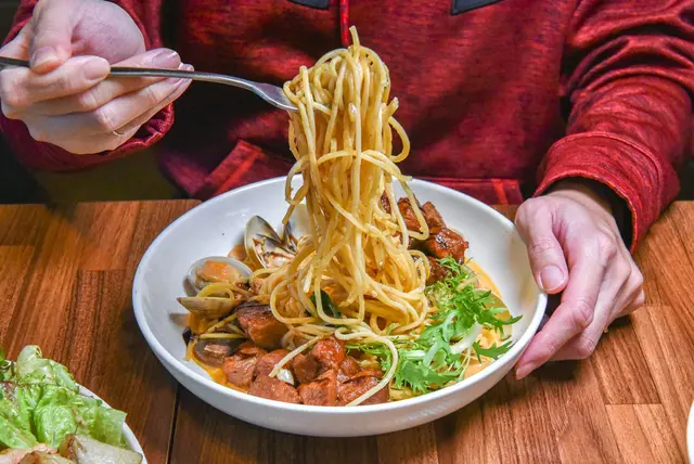 彈牙的義大利麵加入紹興酒製作,因此有著濃郁酒香,加上微辣的調味,直接讓我們一口氣吃光光~