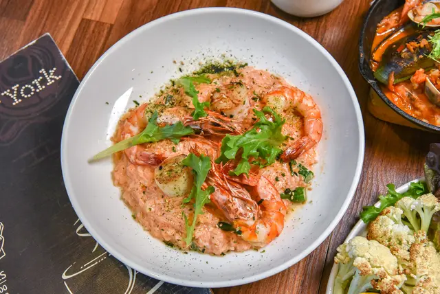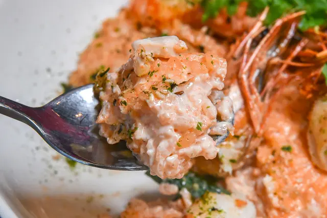 加入明太子製作的燉飯充滿海洋的鮮味,燉飯保有些許米芯的口感,加上脆脆的敏豆層次更豐富,彈牙鮮甜的蝦子有幫忙去殼,所以食用起來格外方便。