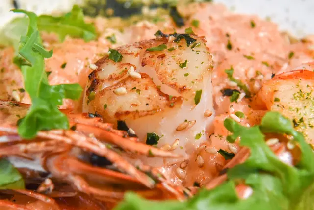 除了三隻蝦子,還有兩顆50元硬幣大、口感鮮嫩細緻的北海道干貝。
