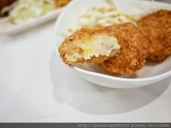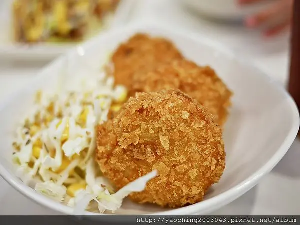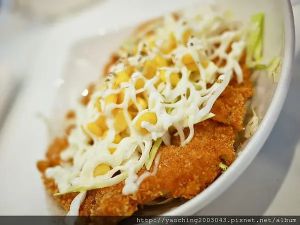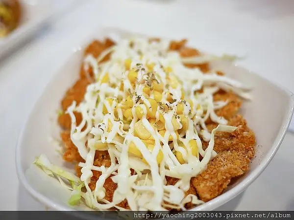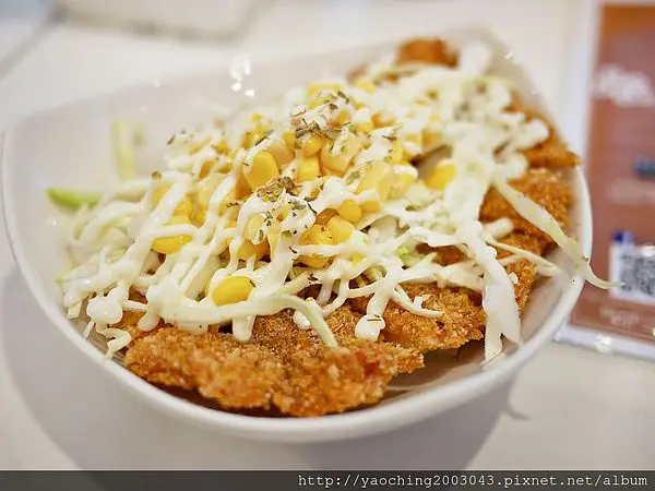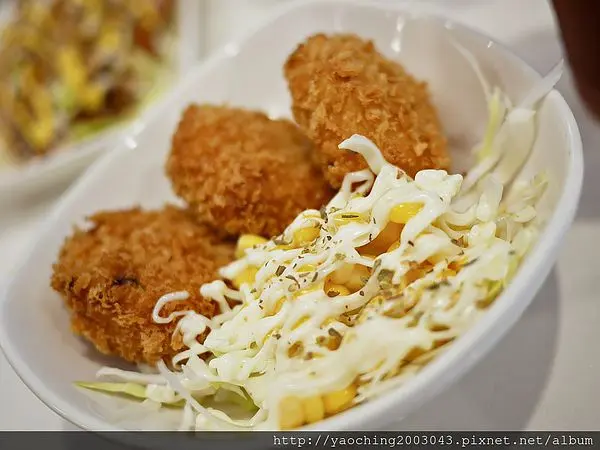 粉裹得也不多,上頭鋪上高麗菜絲 玉米粒 淋上美乃滋...這道建議趁熱吃,冷掉口感會稍硬