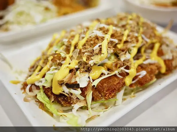 以炸豬排為基底上頭以日式大阪燒的方式進行料理,美乃滋 芥末醬 柴魚片