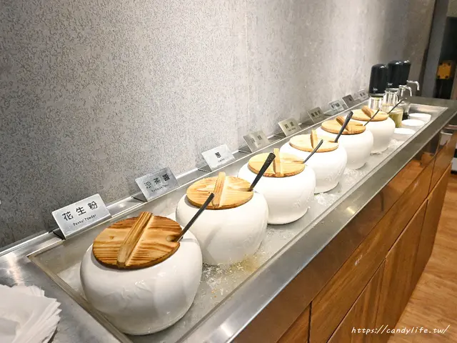 尚石苑的自助吧區分兩邊,一邊是醬料區,有花生粉、沙茶醬、蔥、辣椒、蘿蔔泥、蒜泥、醬油、白醋等可自行調味,另一邊則是飲料、冰淇淋及霜淇淋機