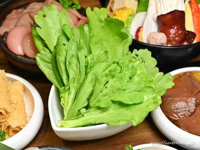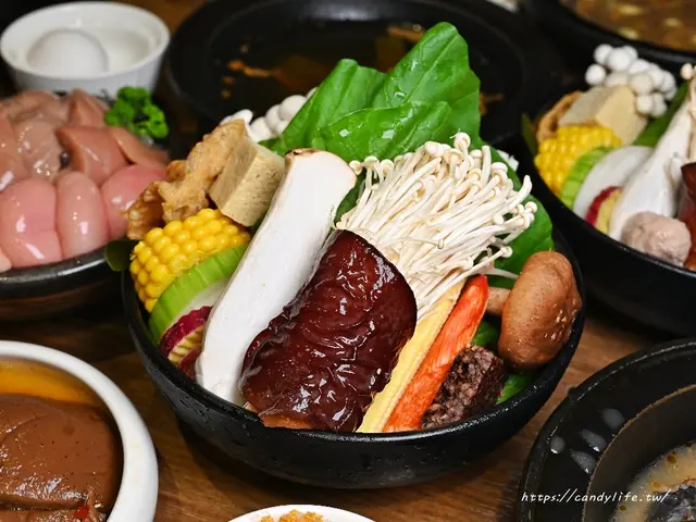 只要點鍋物均會附上一份新鮮菜盤,裡頭食材豐富,有精靈菇、杏鮑菇、金針菇、香菇、木耳、玉米筍、栗子地瓜、玉米、絲瓜、凍豆腐、豆皮、丸子、高麗菜、大陸妹等,超過10種食材,沒有過多火鍋料,以新鮮蔬菜為主