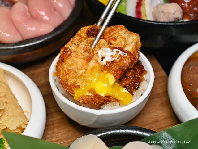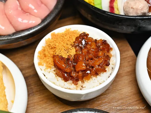 鍋物套餐附食一般會附上雞蛋、粉絲或台梗九號米,另外也可以加價升級王子麵、手打烏龍麵、豬油拌飯或魚鬆滷肉飯,尚石苑不只鍋好吃,魚鬆滷肉飯糖糖也超級推,雖然滷肉偏肥肉居多,不過吃起來不會讓人覺得膩口,鹹香十足,搭配魚鬆超級下飯,糖糖一個人吃兩碗也沒問題,口味完全不輸滷肉飯專賣店呢
