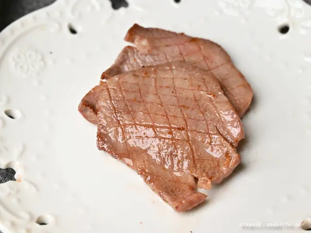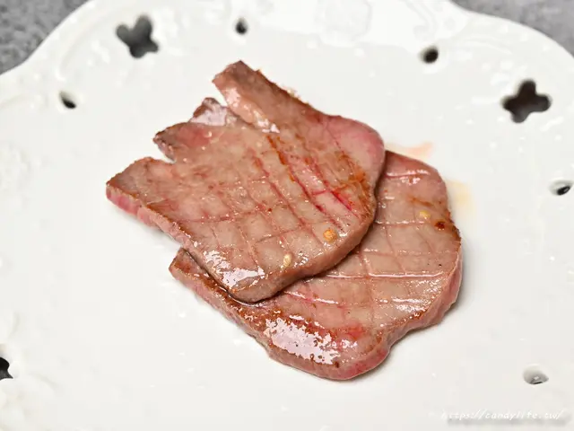 這款仙台和牛舌比較厚切,熟度建議5-7分熟,將兩面烤至金黃焦香,中間還帶粉嫩色澤,口感厚實富有彈性