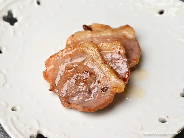 將松阪豬捲成一朵美美的玫瑰花模樣,帶著粉嫩色澤,有著豐富的油花,將兩面烤至金黃色澤,彈牙焦脆的口感讓人欲罷不能阿