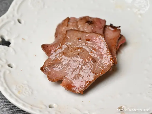 有著細緻的大理石紋油花,帶有微微厚度,將和牛舌兩面烤至微微金黃,中間帶點粉嫩色澤,入口爽脆多汁,吃上一片就想再來一片