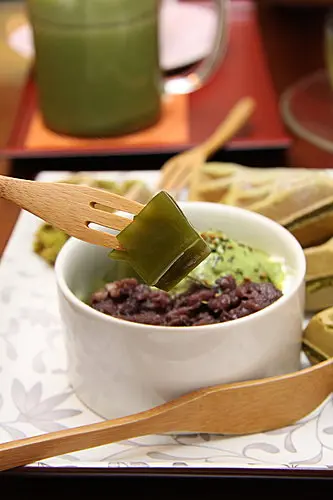這個抹茶凍的口感超好!軟中帶Q,最重要的是,各位看倌呀!真正高品質的抹茶,製作成點心後是這種顏色的啦!而不會是脆綠色的,因為抹茶極易氧化,那種綠得很不自然的抹茶產品,多半都是人工的啦!可別被漂亮的顏色騙囉~~