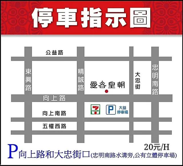 開車的朋友可以停在向上路和大忠街口的收費停車場,一小時20元相當平價,走路過來只要幾分鐘交通很便利,好停車真的大大加分!!