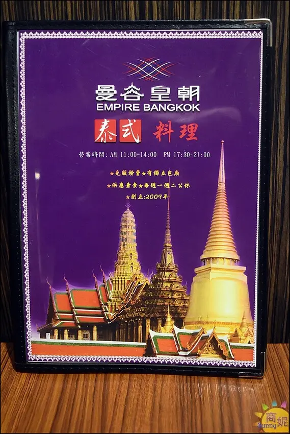 曼谷皇朝環境 大門口就有合菜菜色照片,合菜平日午餐85折、晚餐及例假日9折還免服務費!!相較其他泰式料理餐廳,曼谷皇朝相對划算許多,老闆真的很佛心。