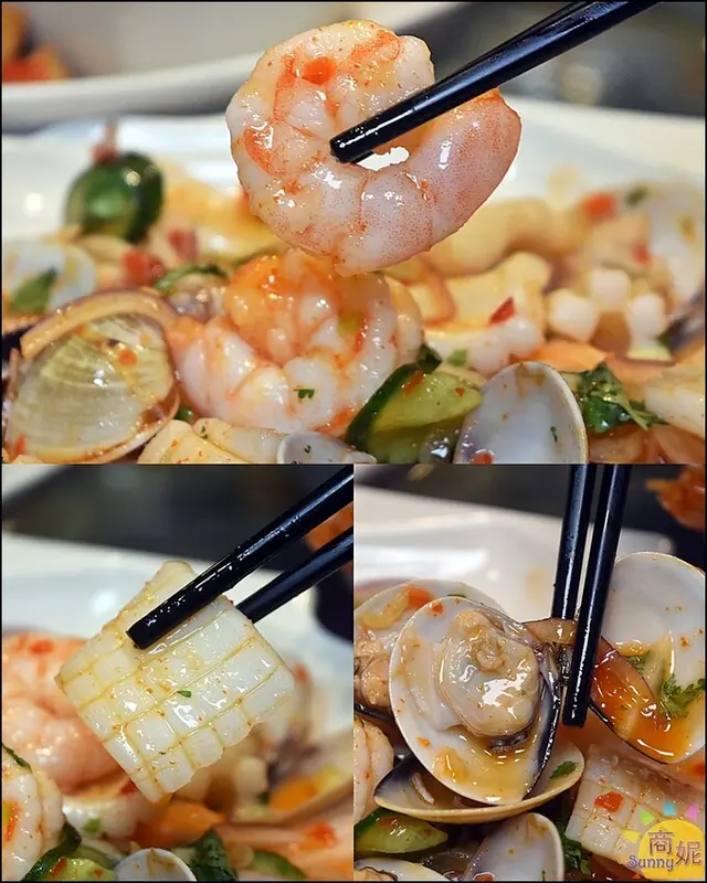 道地的泰式涼拌菜相當開胃,裡頭的料不少有大蝦仁、花枝、蛤蜊,再加上爽脆的黃瓜、洋蔥絲,最厲害的是老闆自己秘製泰式醬汁,酸辣香甜好開胃喔~第一道就讓我們讚不絕口。