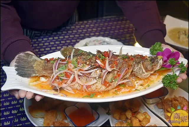 一大隻鱸魚份量不小,酥炸後再淋上店家秘製的泰式酸甜醬汁,色香味俱全。
