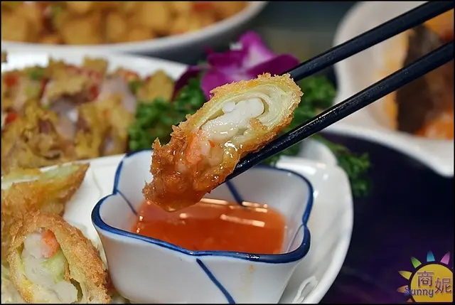 用高麗菜包捲花枝與蝦仁,裹粉酥炸再切開,保有水份吃起來不會油膩,香酥的麵衣口感很不錯。