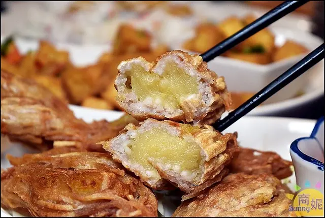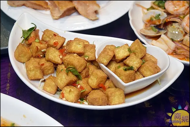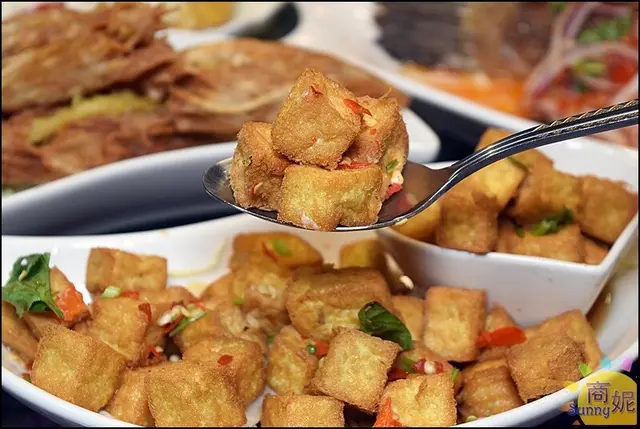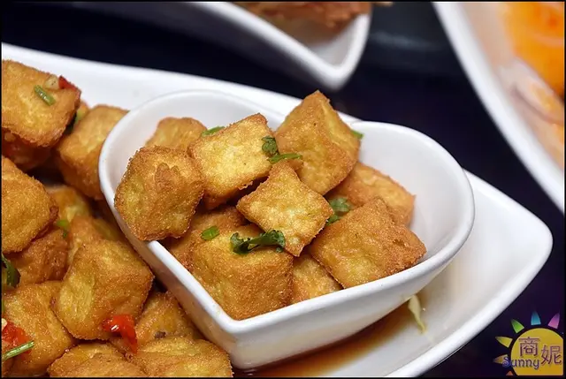 蛋豆腐酥炸後皮酥肉嫩,先吃上層的乾酥炸豆腐,可以吃到外酥內嫩的口感。
