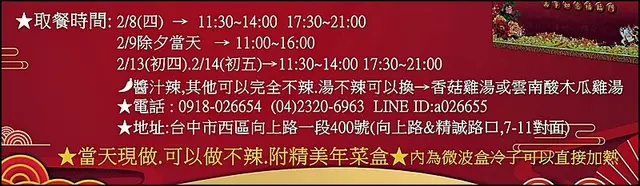 營業時間:11:00~14:00 17:30~21:00(週一週二公休、除夕-初三休息)
