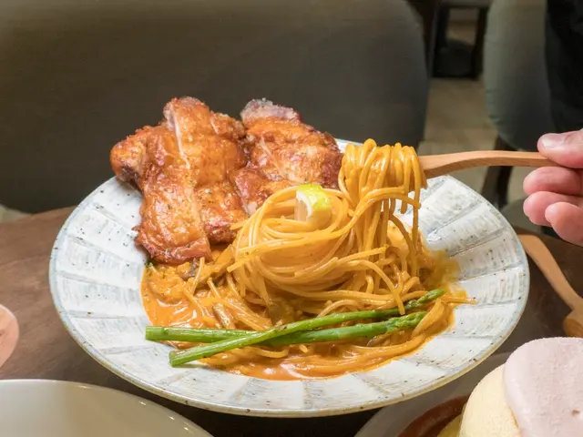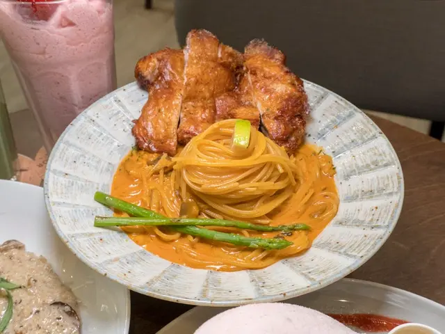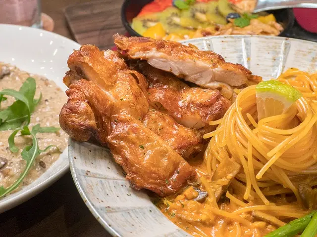 木門咖啡的菜單上有六種義大利麵可以選擇,我們今天選擇帶有微微辣度的叻沙烤雞腿排義大利麵,上桌時的第一印象,黃橘色、又濃厚的醬汁,看起來就很夠味,我們實際品嚐起來也真是如此。沒有過多的裝飾,這是一盤以味道取勝的餐點