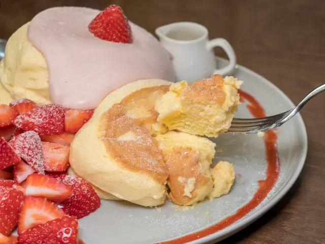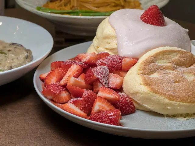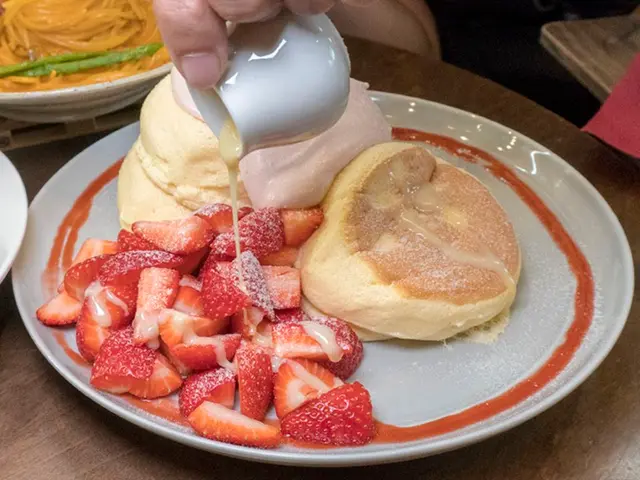 以前是格子鬆餅,現在則是變成了人見人愛的舒芙蕾厚鬆餅,當然要點上一份來嚐嚐。草莓給的份量相當大器,撒上白色糖粉,讓草莓吃起來甜中帶點微酸,口感口味都很迷人。瞧這滿滿的線嫩欲滴的草莓,是不是一副很欠吃的模樣!