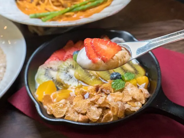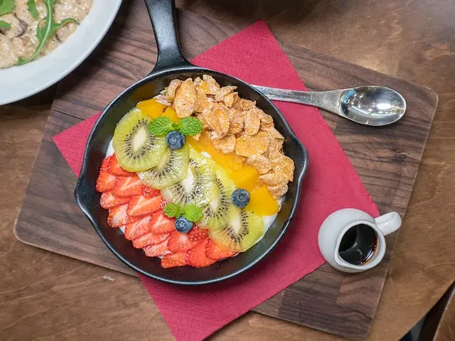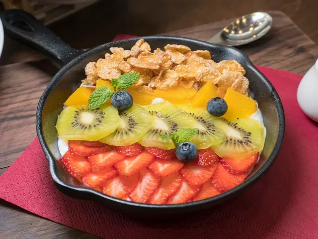 色彩繽紛的水果優格派對,使用平底鍋造型容器來呈現,底層是無糖優格,微微的酸度很迷人。上面鋪滿奇異果、草莓、藍莓、水蜜桃、玉米脆片、多種堅果等等非常豐富。店家一旁提供黑糖漿可以自行添加,加了黑糖漿,整體風味層次又更讚了