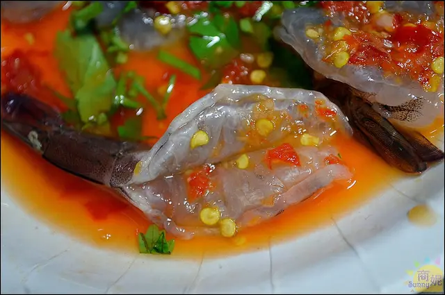 第一青將生白蝦淋上特調的泰式辣醬,畫面不僅漂亮