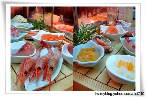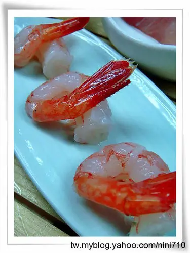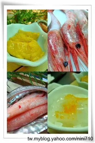 生魚片大拼盤,都是我不敢吃的耶!哈哈哈!不過沒關係,我今天是來專攻海膽與甜蝦的,光看那黃澄澄的海膽我就整個幸福起來,好想來碗海膽蓋飯啊!其他的魚種類我一個也沒記起名稱來,因為我都不敢吃咩!