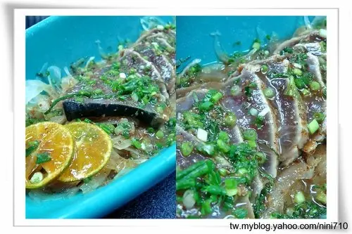 炙烤過的鰹魚醃漬在拌上洋蔥、日本蔥、小柑橘及紫蘇的和風醬中,說有多清爽就有多清爽,不管口感跟色澤都跟我愛吃的生牛肉很相似,不敢吃生魚的我吃了一口,算是有大大的突破了