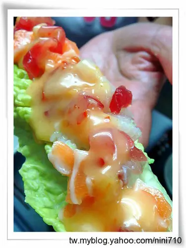 加州壽司捲,源自於美國,專門做給美國人不敢吃生魚時想出來的另類壽司,將切丁的生魚放在蘿蔓生菜上,再擠上香滑柔順的特調美乃滋,美乃滋有著濃稠的水果香氣,感覺起來像是在吃水果沙拉,這樣子我就比較敢吃生魚了