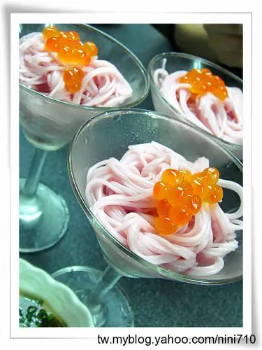 粉嫩迷人的櫻花口味的麵線,像個美麗的小甜點似的,澆點帶有紫蘇氣息的酸甜和風醬汁,滑溜溜的入口,搭配上頭晶瑩剔透的QQ鮭魚卵,視覺、味覺都滿足到了
