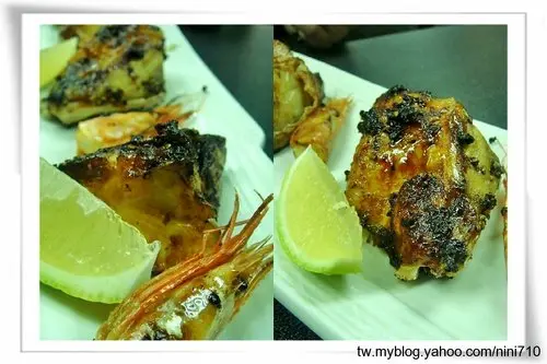 烤鰤魚下巴以及烤甜蝦頭,外表有點焦脆,但是魚肉卻是肥嫩極了,油脂一樣是豐厚的一品,我也比較不愛,擠點檸檬汁或搭配醃漬洛神花會比較爽口些,但我還是來吸我的甜蝦頭好了