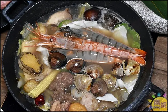 除了牛舌之外,還有另一盤海鮮,草蝦、天使紅蝦、蛤蜊一起下鍋。原本佛跳牆就很甘甜,加上海味之後美味大升級。