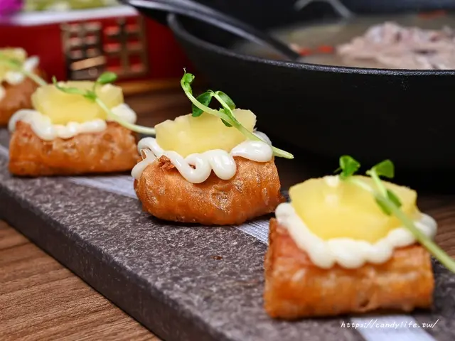 禧珍家鍋物的前菜小點是百花油條,以為他只是一般的老油條那你就大錯特錯啦!在酥脆的老油條上頭擠上美乃滋,再搭配鳳梨片,內餡還藏了飽滿的花枝漿,外脆內紮實的口感,伴隨的花枝漿的鮮甜,裡頭還吃得到花枝肉,這道超好吃,會讓人大大驚豔的那種