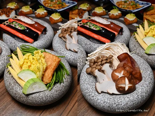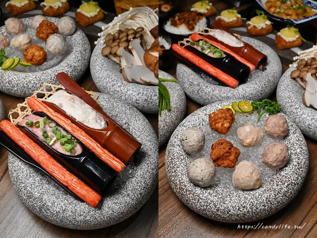 漿類拼盤裡頭有花枝漿及豬肉慕斯,旁邊還有附上很長很長的蟹肉棒,花枝漿口感Q彈,裡頭還可以吃到花枝塊,豬肉慕斯是採用台灣溫體豬肉以甜點慕斯的手法製作,口感滑嫩,吃起來不會有腥味,另外丸子拼盤裡頭有松露丸、牛肉丸、獅子頭及貢丸,其中松露丸跟獅子頭比較特別,松露丸香氣四溢,獅子頭可愛又mini,口感相當紮實呢