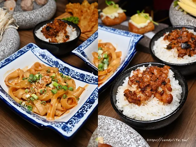 套餐主食是白飯、冬粉、雞蛋三選一,可另外加價換購其他主食,糖糖加價換禧珍家鍋物的招牌油潑麵及人氣滷肉飯,糖糖很愛禧珍家鍋物的油潑麵,麵條採用手工刀削麵,搭配店家特製辣醬, 口感Q勁十足,吸附著濃郁辣醬,讓人越吃越過癮
