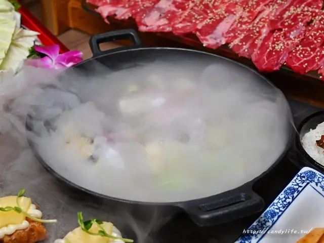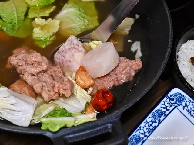 除了剛剛的夢婆湯,另外這個神仙佛跳牆也是會冒煙的,上桌畫面宛如神仙下凡,沒想到中式佛跳牆也可以變成鍋物的湯底之一,採用老闆獨門配方所熬製而成的,裡頭有排骨、紅棗、蒜頭、香菇、蝦米、鳥蛋、大白菜、干貝、芋頭等豐富配料,湯頭濃郁鮮甜