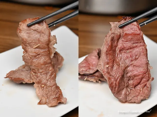 手切跟機器切就是不一樣,手切肉品厚度比較厚一些,伊比利豬的色澤跟牛肉很像,伊比利豬有別於一般的豬種,就是他可以不用吃到全熟,大約涮至7、8分熟,肉質軟嫩多汁,嚼起來還帶有獨特的香氣,另一個金錢腱跟一般的牛腱肉可是不一樣的,金錢腱的筋肉層次分明,口感又香又嫩,讓人越吃越香