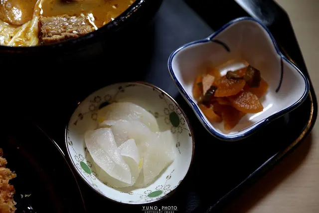 附的小菜是主廚自製柚子蘿蔔、福神漬 味道還蠻不錯的 吃完還可以無限續