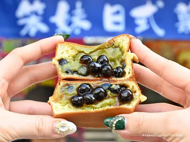 以為綠油油的餡是抹茶餡,那你就大錯特錯啦,這款顏色稍微偏軍綠色的內餡是店家採用台灣四季春茶葉所製作而成的,裡頭加入黑糖珍珠,濃郁茶香中伴隨著珍珠的Q彈及黑糖香,口感豐富,好吃不甜膩,沒想到四季春茶也可以做成車輪餅的內餡吧