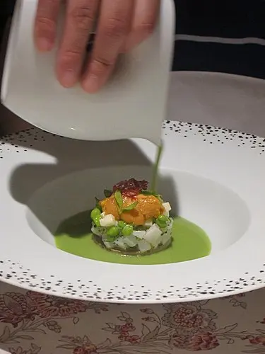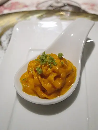 青豆冷湯與海鮮、馬糞海膽、花枝與海藻卡士達,A~這個我也沒吃到~會記得菜名是因為,店家有給我一分菜單。。。。