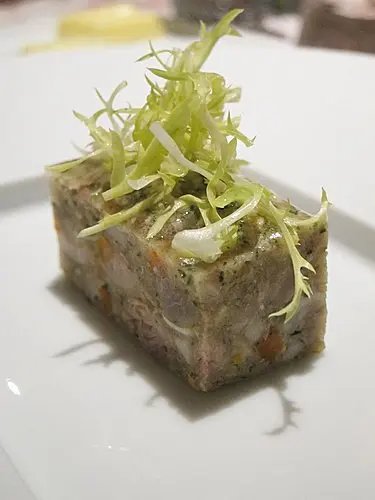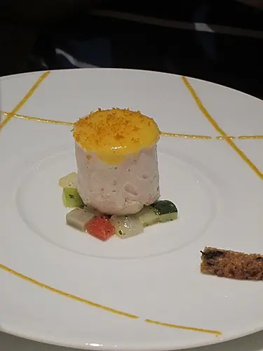 古早小母雞與明蝦、紹興蛋黃醬、及蔬菜丁,做成幕斯的小母雞肉,樣子很可口,但我還是沒吃到~~@@~