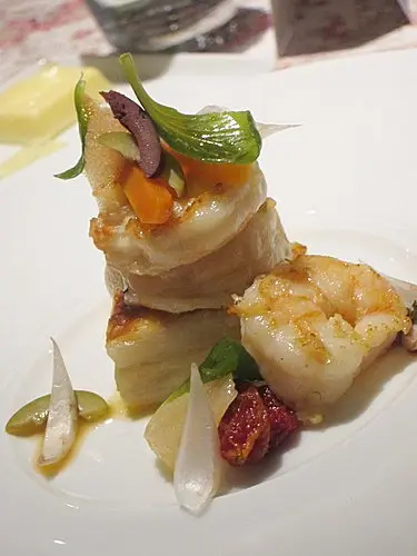 甜蝦與農場小蔬菜,沙拉與海鮮醬汁,這個好好吃!那蝦肉極為彈Q,調味也很棒!帶著淡淡酒香味,味道很不賴!吃到這裡,隔壁桌有人在求婚耶~好替他們開心喔!一定要幸福喔!最後我們這桌請他們那對新人喝酒,大家都站起來幫他們鼓掌!祝他們百年好合!