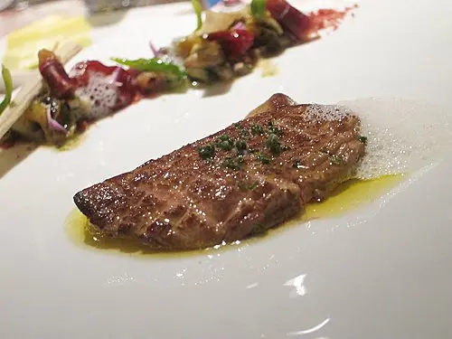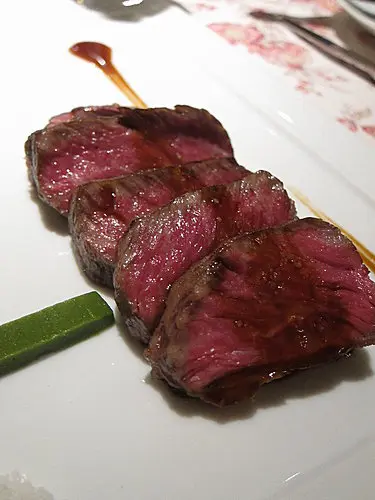 點給貴賓的主菜都是牛排,這裡不知道為什麼牛排都是極黑和牛的牛小排部位,我後來有分食到一塊牛排,總覺得牛小排做五分熟實在是不太對~咬起來會有點咬不動哩~