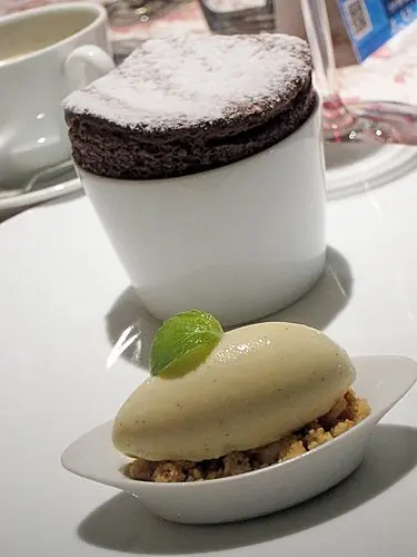 單點的覆盆子舒芙蕾佐大溪地香草冰淇淋與手工巧克力米~這是我的,還行啦~沒特別的驚艷~