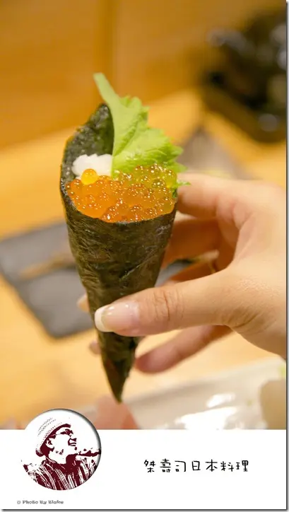 手捲用紫蘇葉來搭配鮭魚卵,吃起來有波波的口感,鹹中帶一點紫蘇的香氣再與醋飯合著吃,還不賴,唯一可惜的是布雷克顧著拍照,海苔有點軟掉,沒有原本的酥脆,反而有一點濕硬,下次可能會怒點手捲吧!