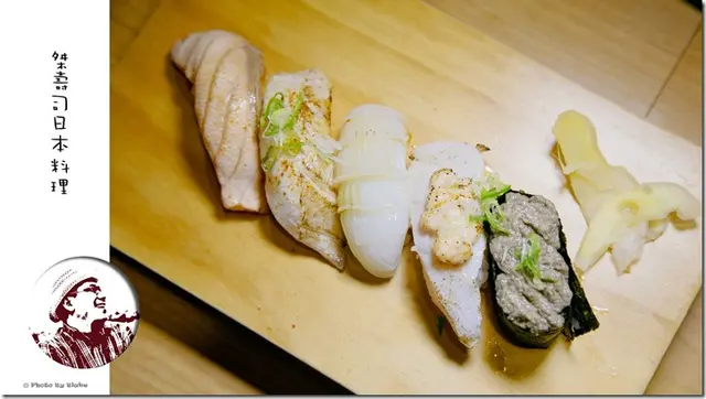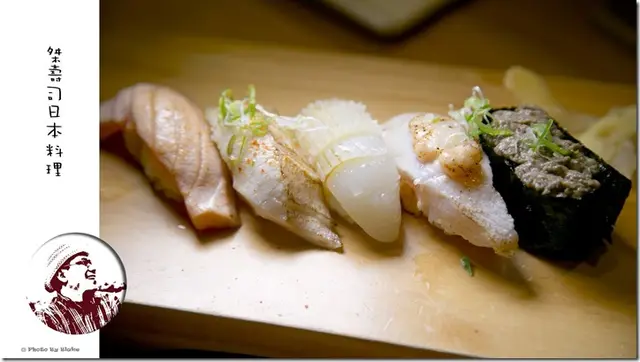 吃完前面幾道後,其實有一點飽,沒想到還有炙燒握壽司,580元的價位有蟹膏軍艦、明太子旗魚、炙燒花枝、炙燒鮭魚與炙燒海鱺,花枝起來彈性很足,明太子旗魚比旗魚生魚片來得出色,鹹中帶甜,但鮭魚的部份就沒有原本鮭魚生魚片來得好,印像最深的是蟹膏軍艦,吃起來甜綿的感覺,鮮味十足,這樣整個餐點才$580元,真的是很超值的享受。