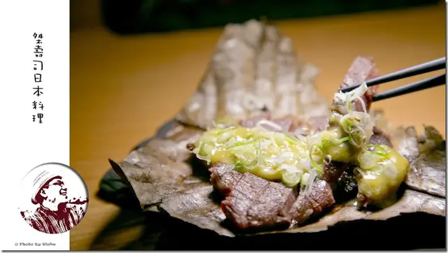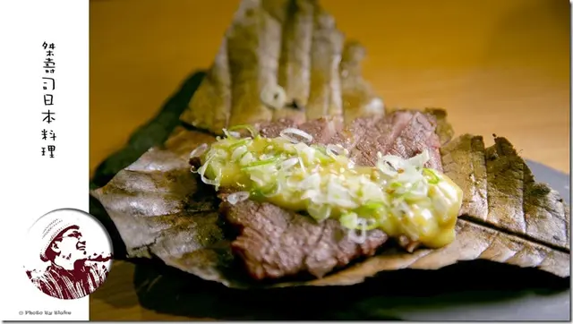 牛肉是用安格斯牛肉,烤到半熟後淋上味噌與蔥花,味噌帶有些許的酒味,牛肉可以看到裡面還保有柔嫩的粉紅色,布老大說吃下去肉質很軟嫩,但甜味上少了些。