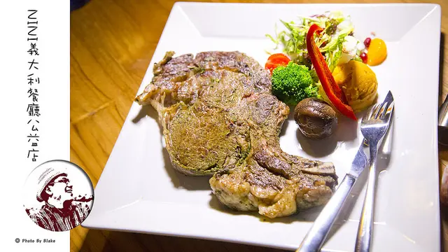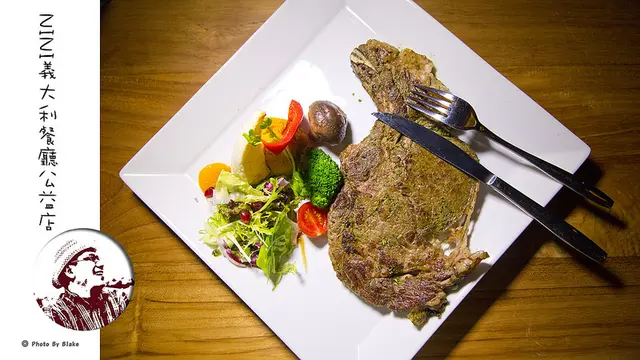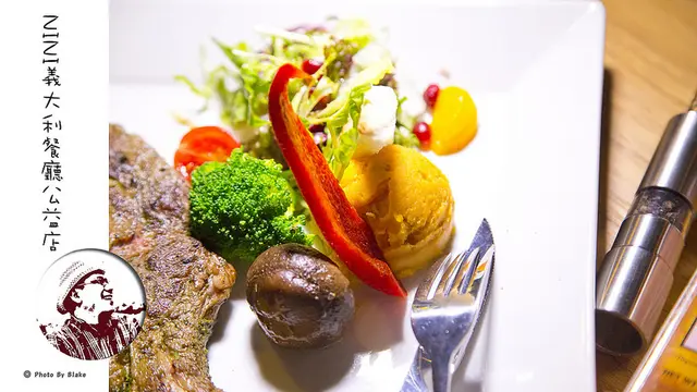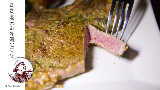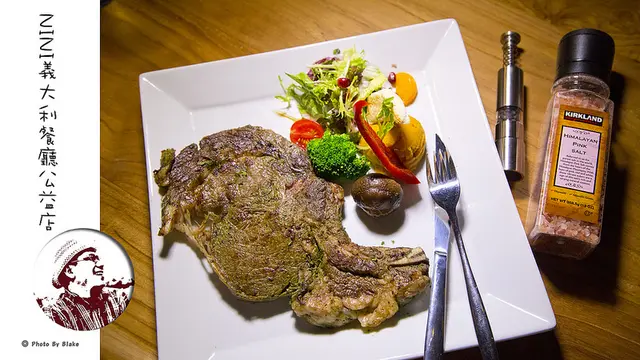 之前去NINI尼尼義大利餐廳台茂店用餐,大多都是點上義大利麵,這次來用餐點上一份牛排,這卻是第一次,NINI尼尼義大利餐廳台中公益店的香料帶骨沙朗是選用美國Choice等級牛肉,一上桌你就會讓其份量給震了一下,整片沙朗牛排幾乎布雷克兩隻手掌打開的大小,五分熟的熟度看得到粉紅色軟嫩的肉質,上面灑了少許的義式香料,不吃牛的布雷克只好問一下布媽的口感與口味,布媽直說這肉質真的很軟嫩,吃起來牛肉的甜味也很足夠,鮮味中帶有濃郁的油脂,微微的義式香料與炭烤焦香,讓味道上很有層次,布雷克建議布媽沾一點玫瑰鹽,布媽直說甜到口水都流出來了。配菜的生菜水果沙拉,酸酸甜甜的味道正中合牛肉的油膩,一球蕃薯泥,吃起來甜味很足夠。