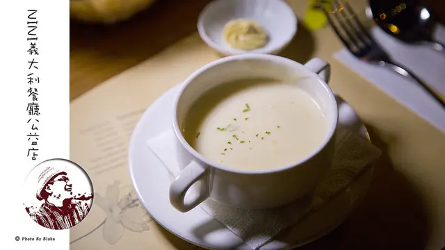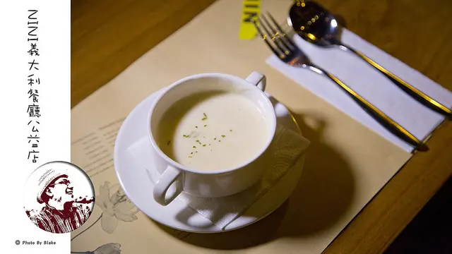 在NINI尼尼義式餐廳點餐,你可以選擇單點主餐之後再加上130元升級套餐,就會有餐前麵包附抹醬、每日濃湯、套餐飲料任選餐後甜點,一整個就超划算的。餐前麵包外層酥脆,內裡是蓬鬆有彈性,麵包切開後抹上店內獨特的鮪魚醬,吃起來鹹甜鹹甜還有股奶油味,整個味道非常濃郁。濃湯的部份建議早一點喝,因為是以麵糊加上奶油、紅蘿蔔和玉米粒為底去熬煮的,不是那種以由濃湯塊或玉米濃湯粉煮出的,因此放冷了後會太糊,熱喝可以喝到香濃的奶油味與玉米粒的甜味。
