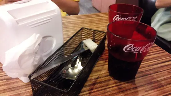 半自助區,有醬料、水、汽水隨你拿。點完餐店員會送上餐具、空杯子,想喝什麼自己動手,