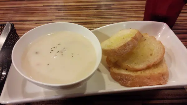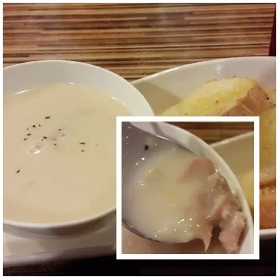 首先上桌的是 升級每日濃湯手工麵包點餐升加價60元~好吃 濃湯味道帶點海鮮味,裡頭的料有火腿、燻雞肉很好喝。