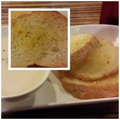 麵包烤的非常的酥脆,蒜香味很夠~真的是很好吃的開胃菜~只是兩人只能共享這三片麵包,第三片是要用搶的嗎?