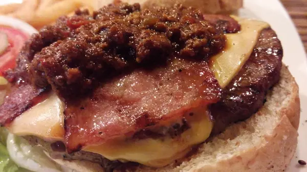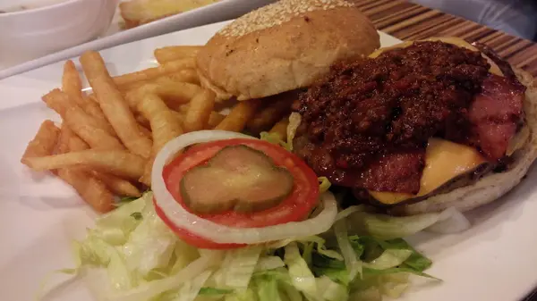 嗆辣肉醬燒烤堡 單層195元 (雙層220元) 漢堡外就薯條、沙拉,這是店家主打之一,